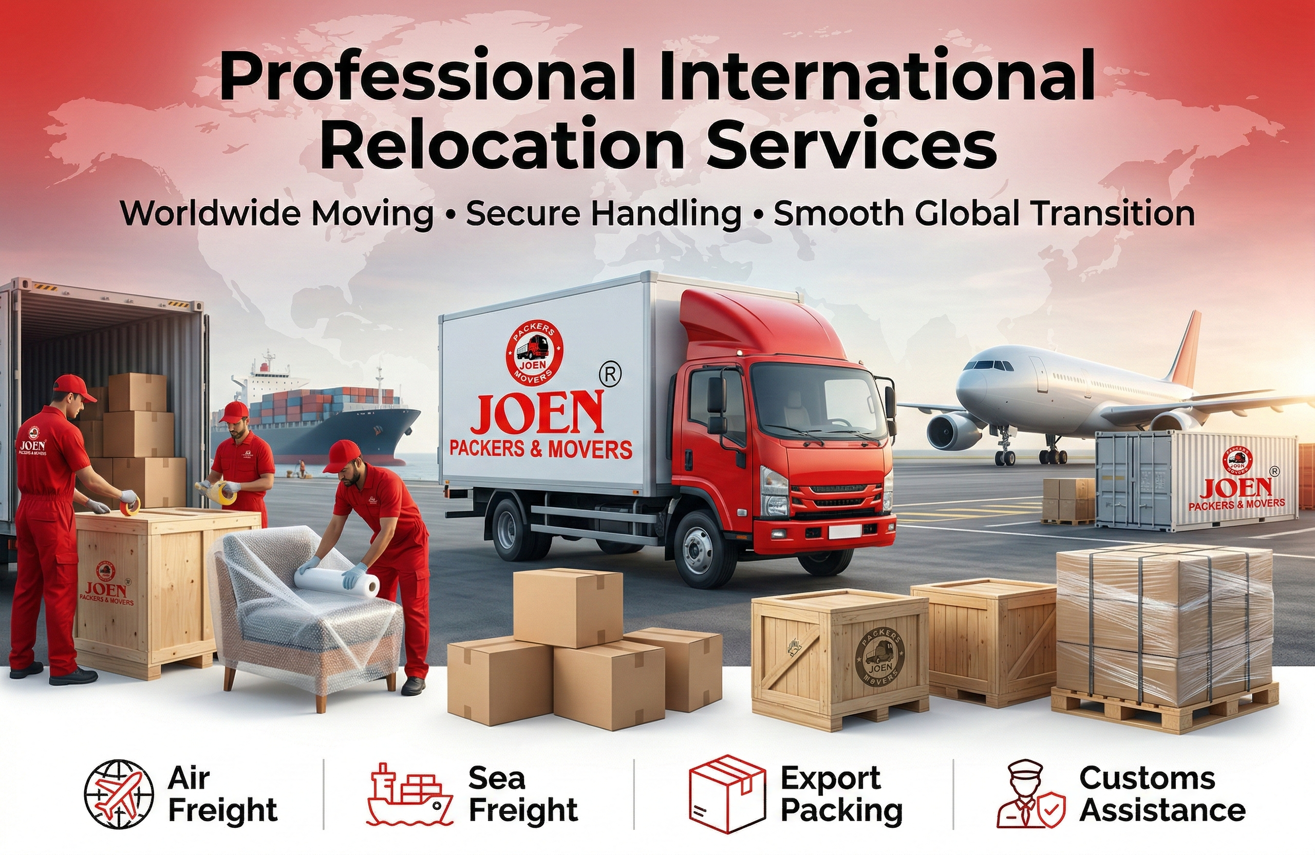 Joen Packers and Movers offers professional and secure International Relocation Services for individuals, families, and corporate clients moving abroad. We provide complete global moving solutions including international packing, shipping, customs clearance, insurance, documentation support, and door-to-door delivery worldwide.