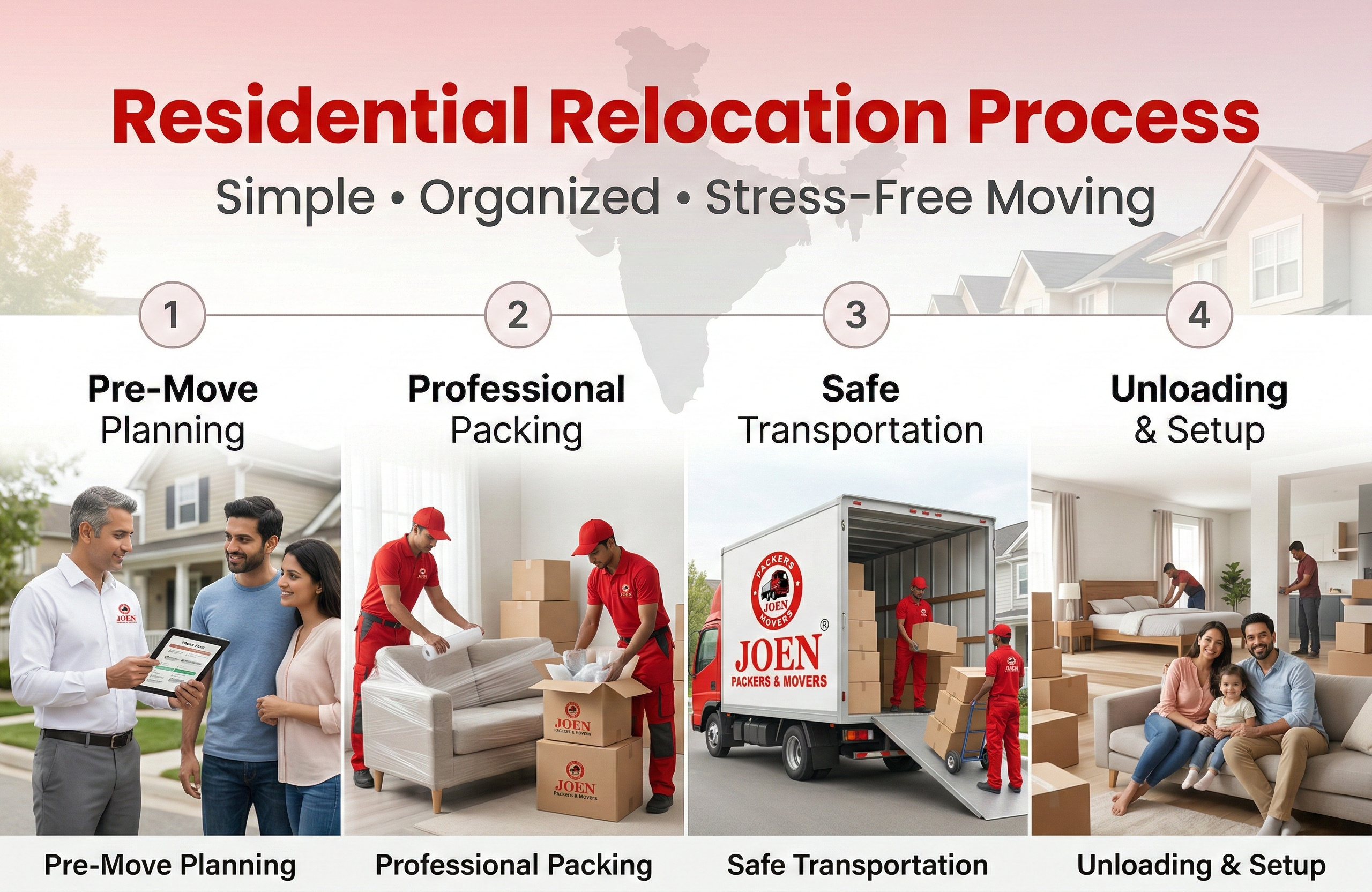 In the field of Residential Relocation Services Joen Packers and Movers is a top leading company in India, they provide all type of packing and moving services at inexpensive price, We promise our customers to deliver housing relocation services to every city and region in India.