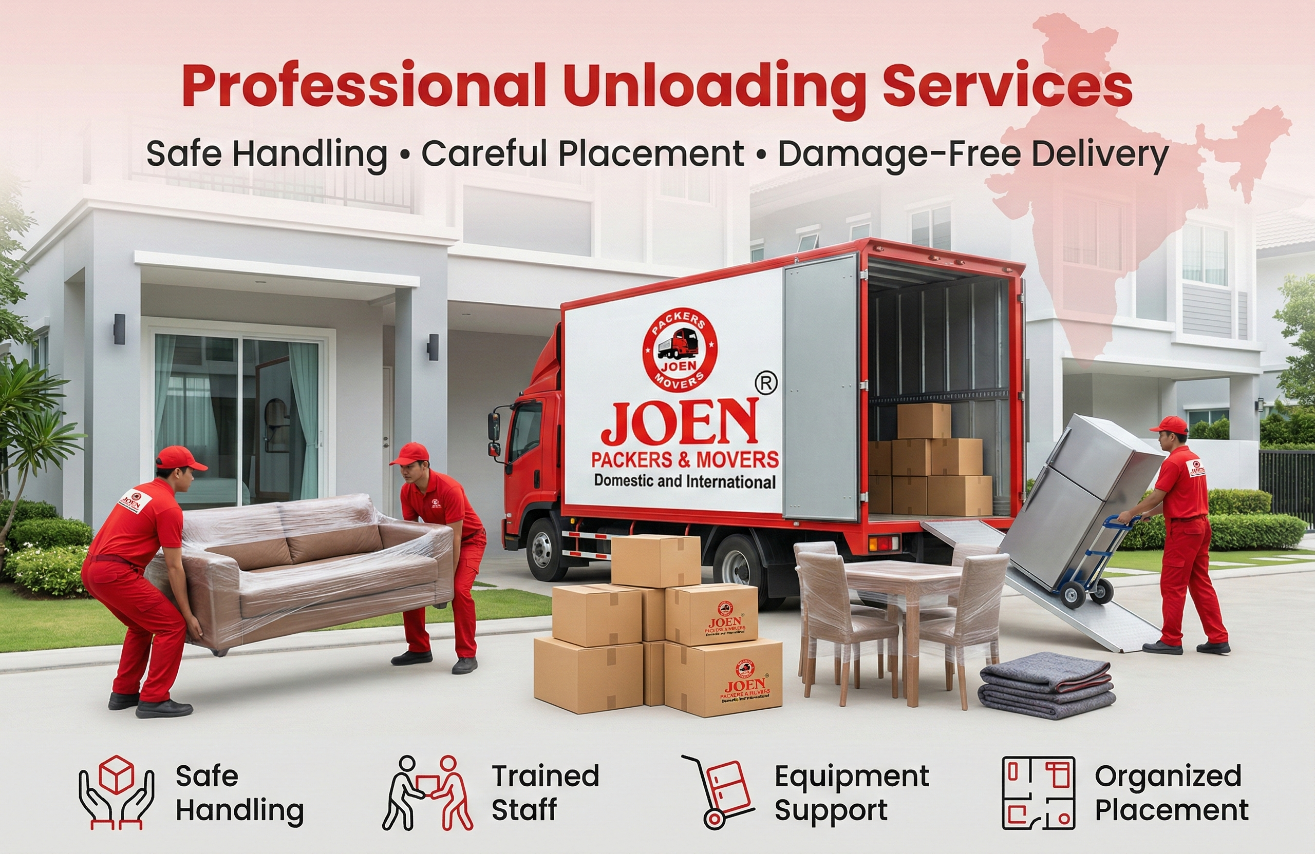 Joen Packers and Movers provides safe and efficient Unloading Services across India for residential, commercial, corporate, and industrial relocations. Unloading is one of the most sensitive stages of the relocation process, and our trained professionals ensure your goods are handled with complete care and precision.